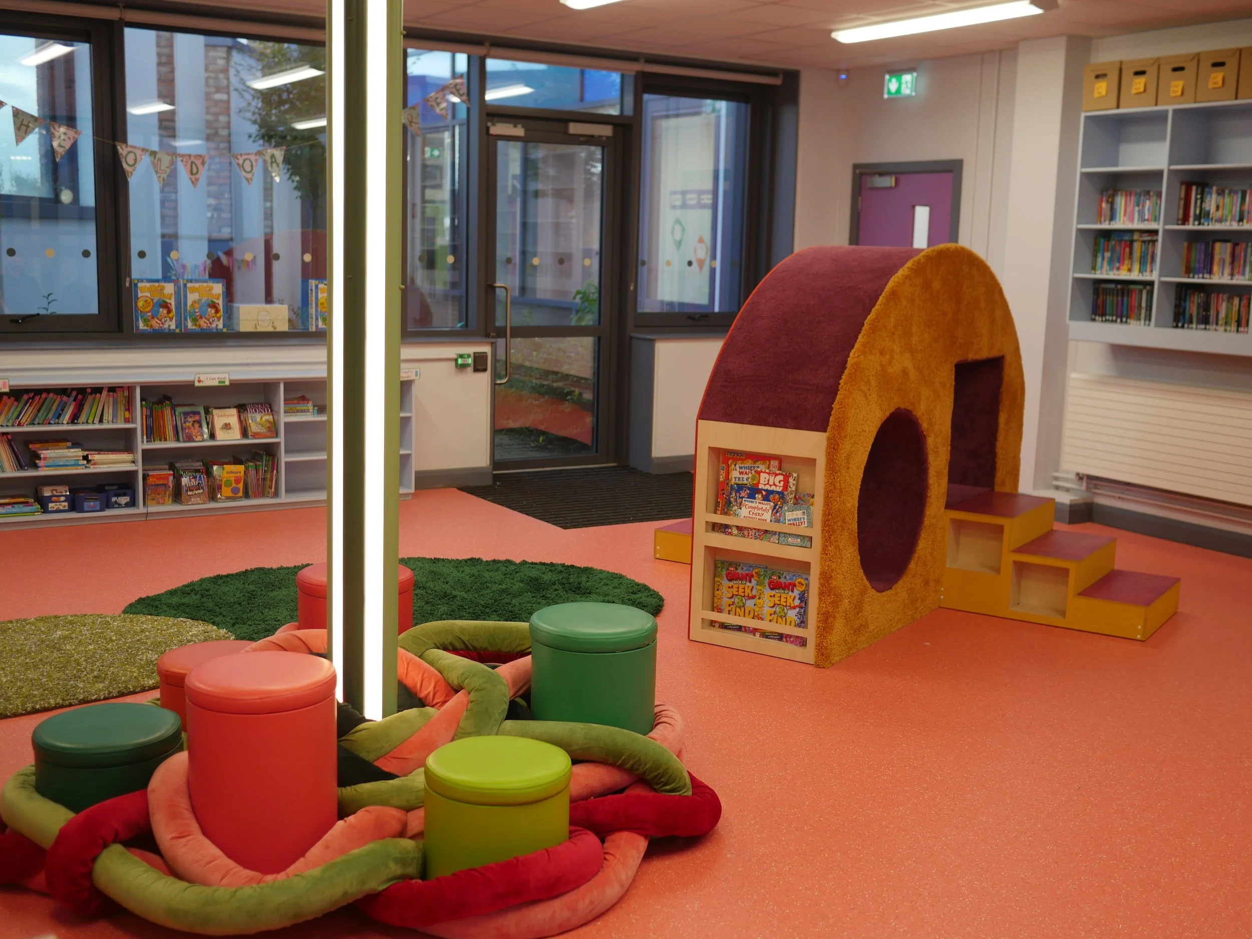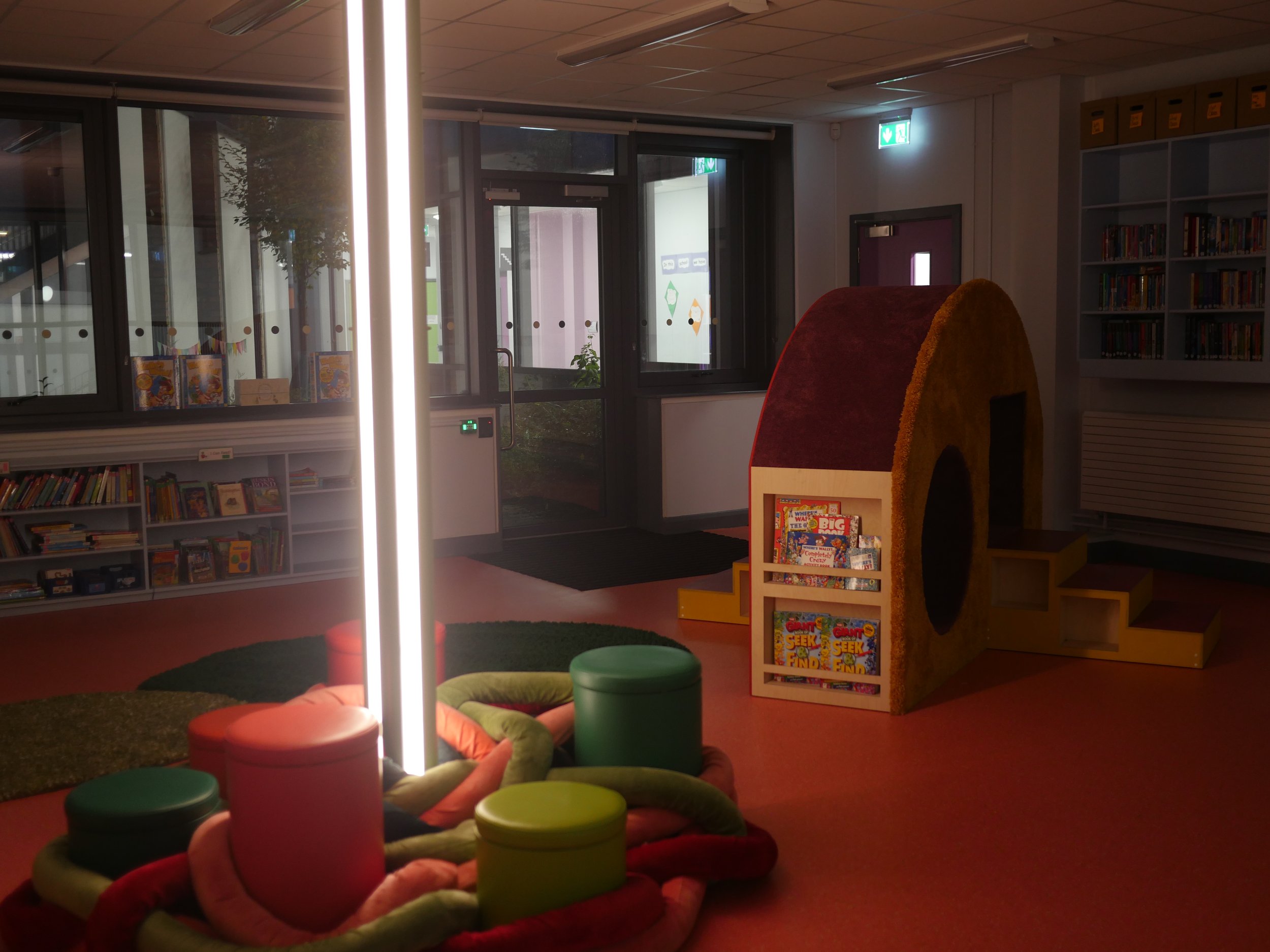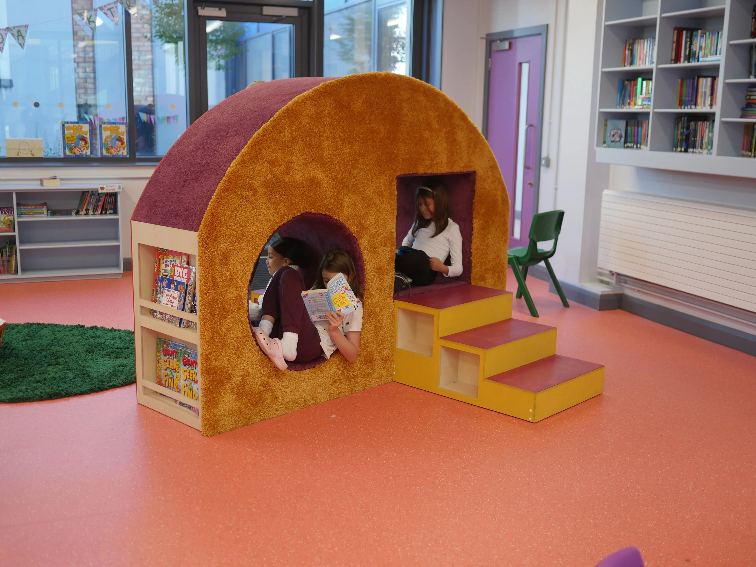 The commission is now complete. The final artwork is a sculptural furniture piece permanently installed in the school library - a functional, inhabitable work that blurs the boundaries between furniture, sculpture, and play space. It was fabricated in direct response to the artworks made by the children during the residency, making the community genuinely the authors of the piece.